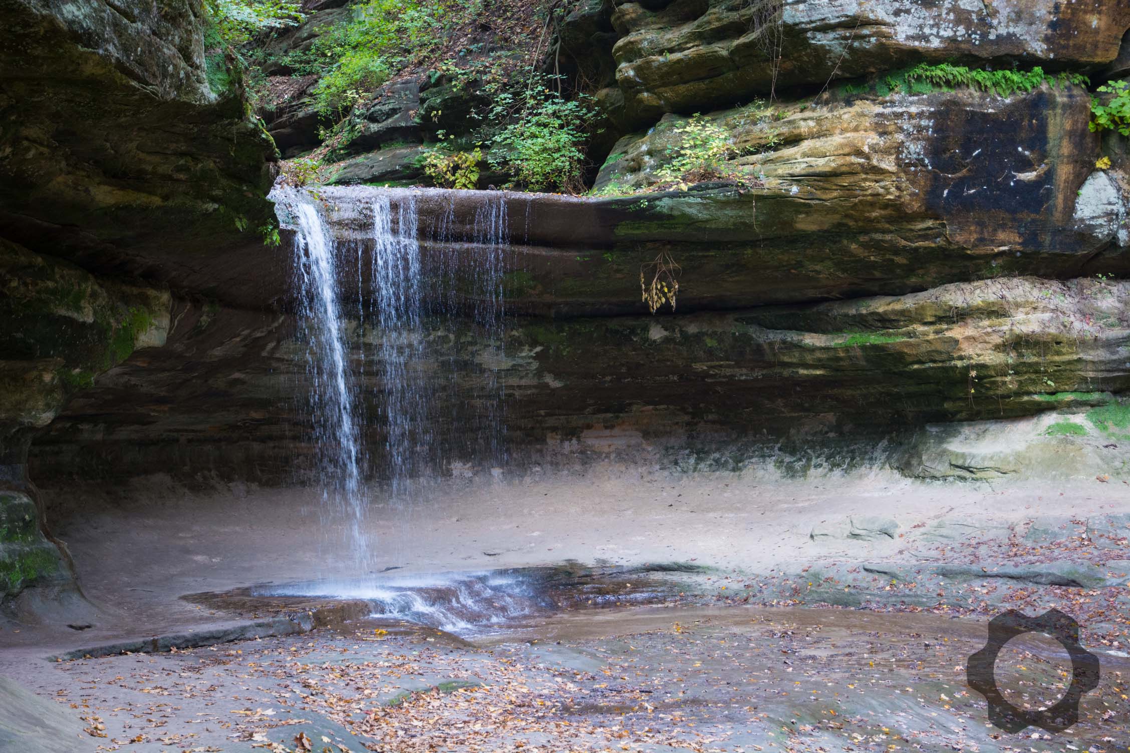 This wallpaper is a shot of LaSalle Canyon at Starved Rock State Park. The waterfall is sparse in October but the flow can be very heavy in the spring due to the snow melting. Visitors are always poising under the waterfall for a quick photo.
