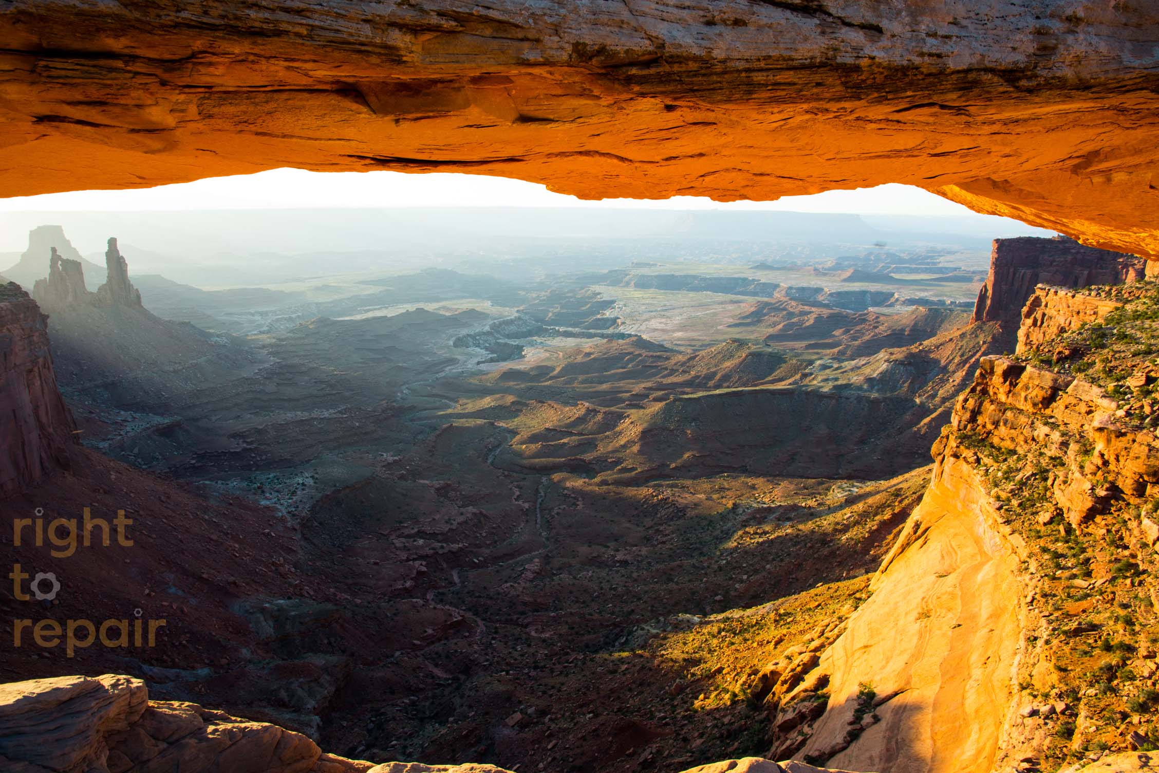 Mesa Arch at the Island in the Sky district of Canyonlands National Park. A fitting wallpaper for our Framework Laptops. This arch overhangs a U-shaped canyon. At dawn the sunlight hits the canyon wall which reflects up and lights the underside of the arch giving it that famous orange glow. The bright glow only lasts ~15 minutes and then starts to fade.