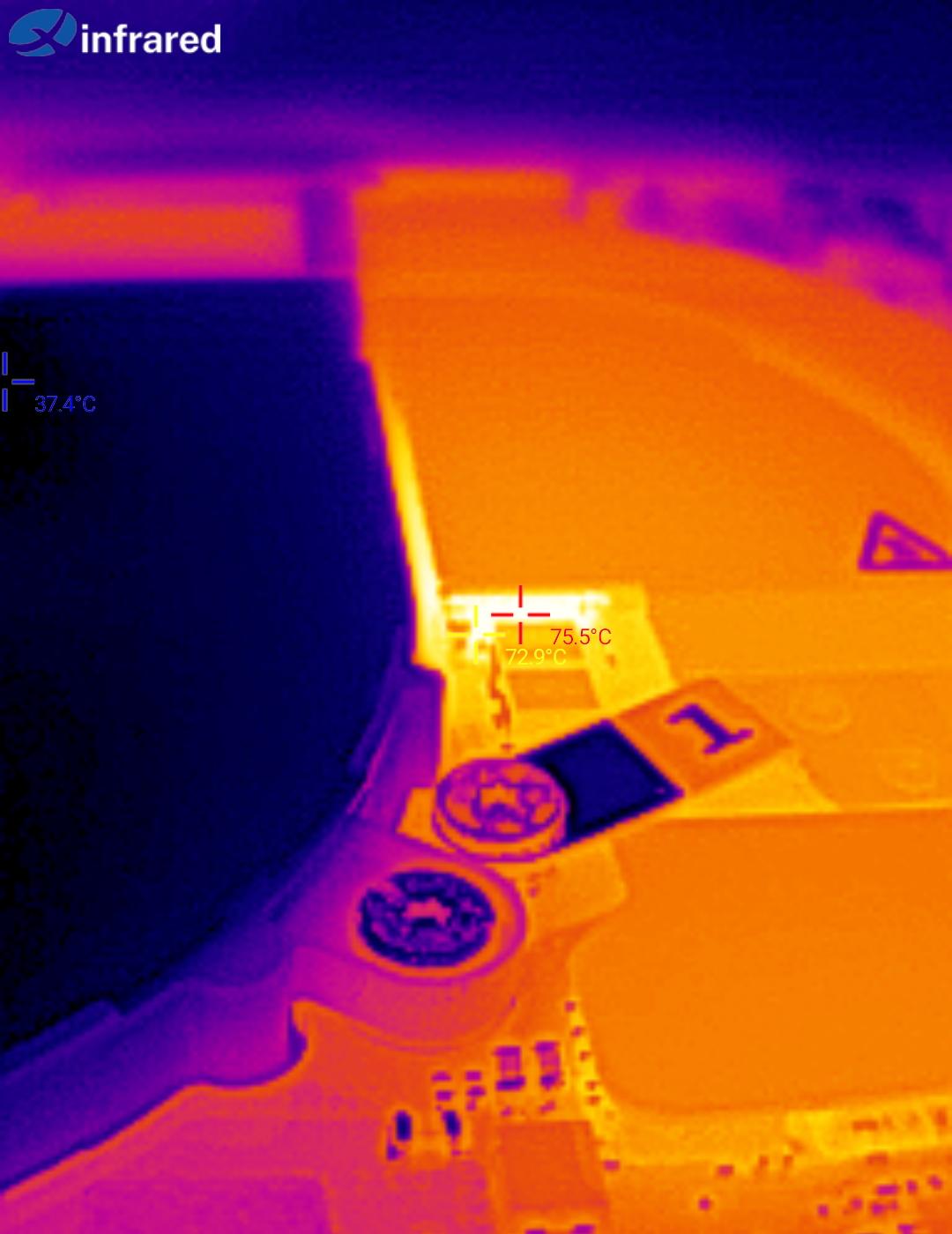 This nice thermal image was taken after running 30W sustained. You can clearly see that the two VRM chips next to the CPU are the hottest, the upper one running at 78.8°C surface temp. Its core temperature will be a bit higher, but its also rated at 125°C max, so no problem.