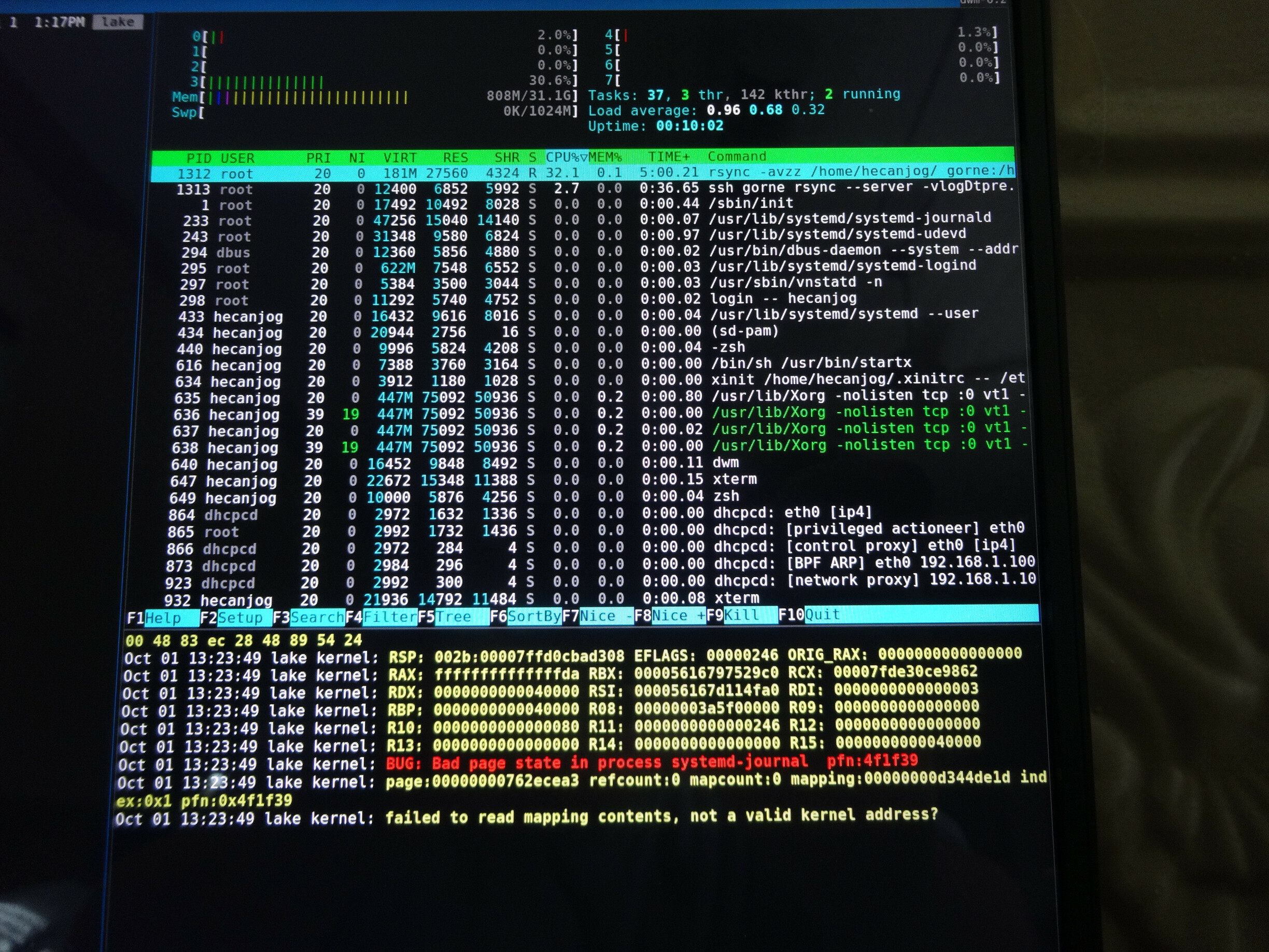 So I rebooted again, left the wifi card disabled completely and tried the rsync again over ethernet. (Via a USB dongle.) This time I didn’t see journald pegging all the CPUs, it froze like this instead: