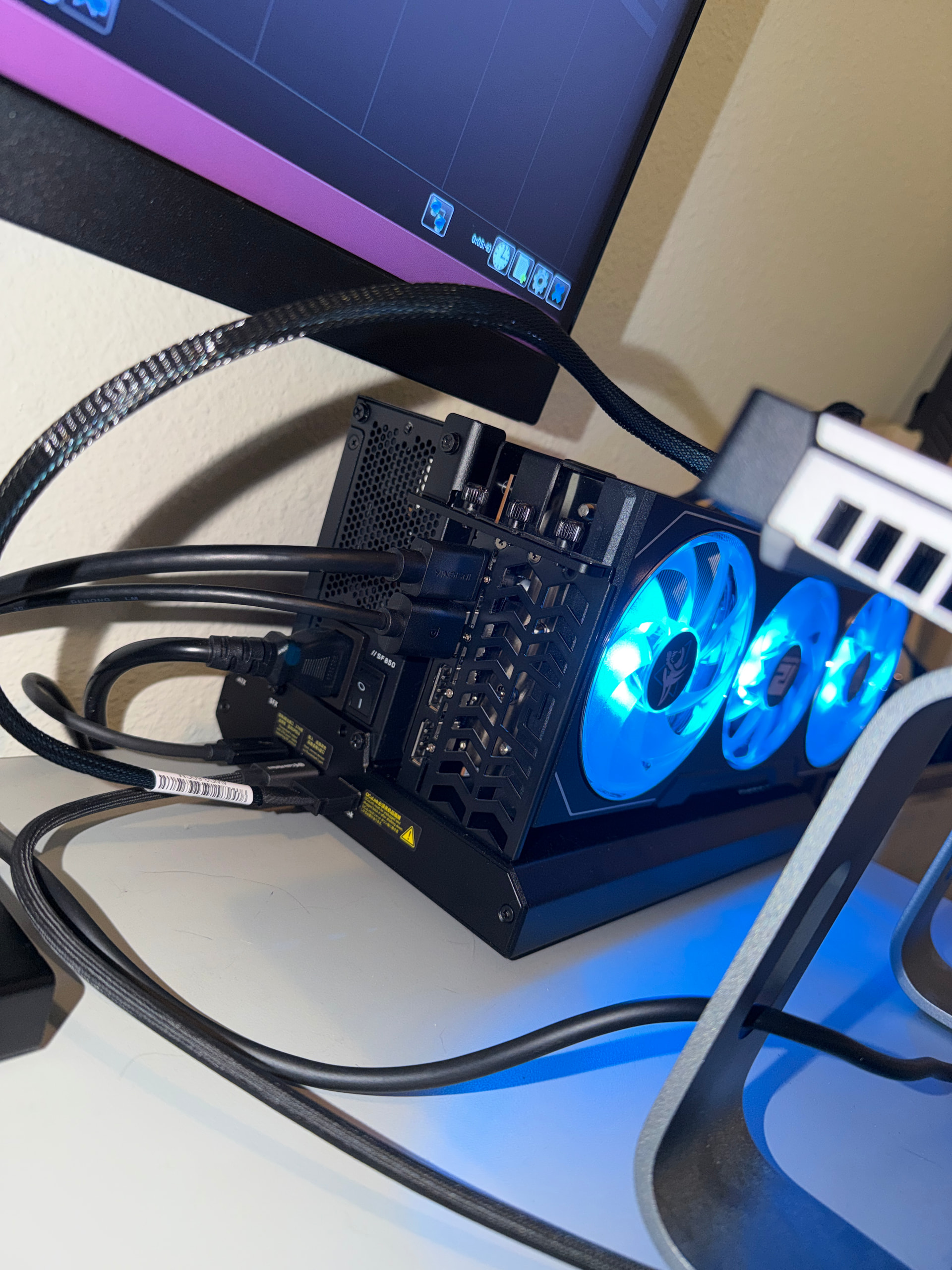 noise step 2: the MSI A850GL PSU is a very good one, but it does not have a zero fan mode. And even though its sound is a pretty gentle woosh over time it’s too much. I guess it would not be a problem if I put the DEG1 into an enclosure under my desk, but with oculink cables being so short it’s not an option. So I replaced it with a Corsair RM850x (2024): fans never spin unless load is above 30% of 850W. Since my 9070 draws at most 220W it never triggers the fan