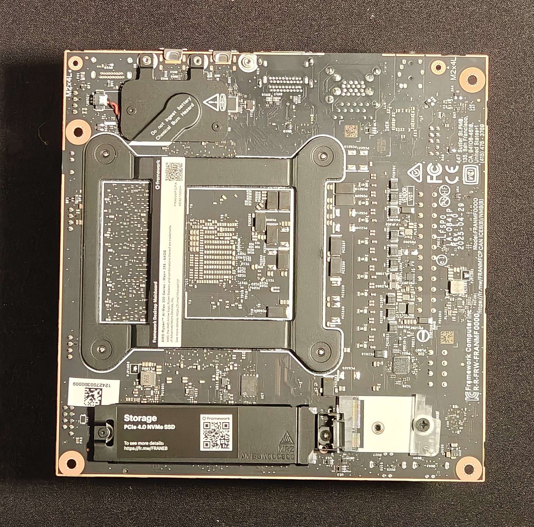 I’m starting on a build using the framework desktop (obviously). But I’ll be watercooling the system, as you probably know the cooler makes contact with not just the APU but also the RAM modules and the VRM, so I’ll be building a custom cooler/heatspreader/etc to cool those. But since I couldn’t find good pictures online of the naked motherboard, I took my own.
