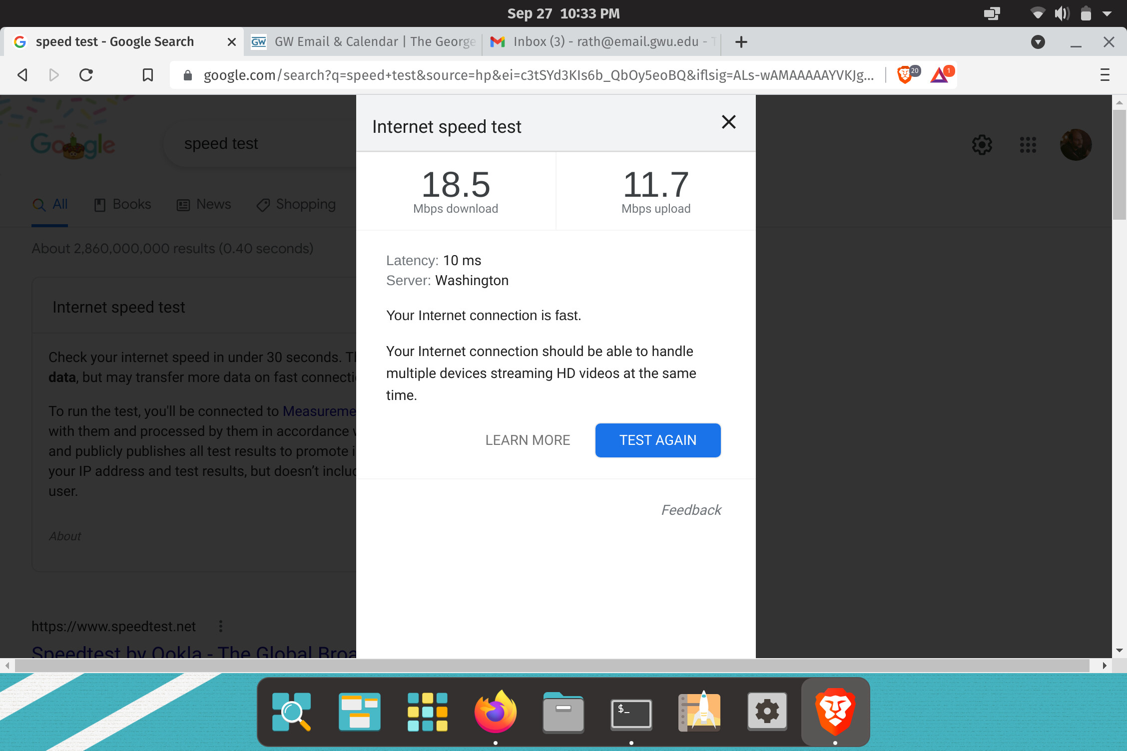 I have ComCast router. With my old MacBook Pro, but with PopOS as the main operating system, I got 87 - 100 mbs download speed